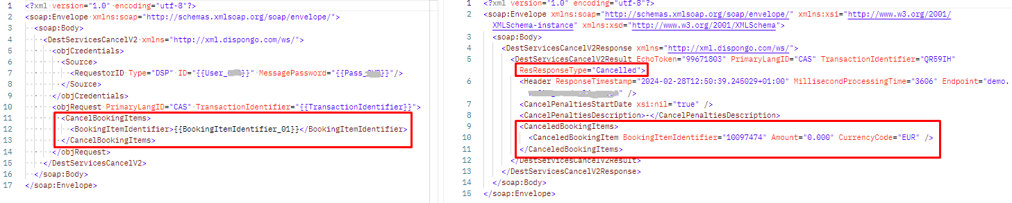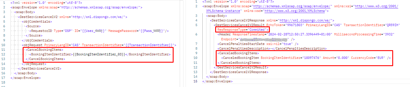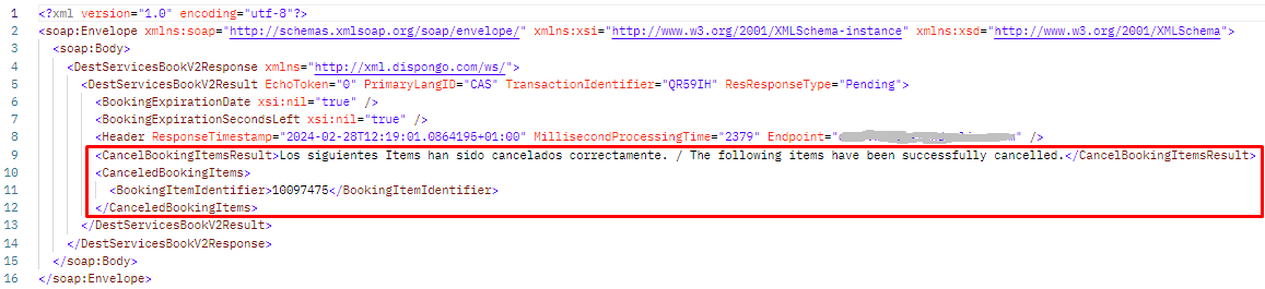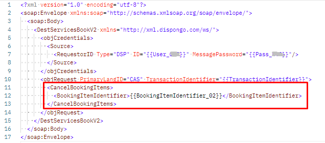 "DestServicesCancelV2" indicating the "BookingItemIdentifier" that we obtained when adding it to
